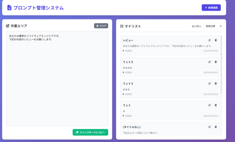 (今回は「プロムプトを管理・再利用できる静的なWebツール」というお題を設定しました。)